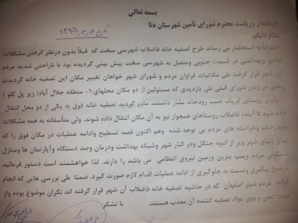 نامه اعتراضی جمعی از مردم سی سخت در واکنش به شروع عملیات احداث تصفیه خانه فاضلاب