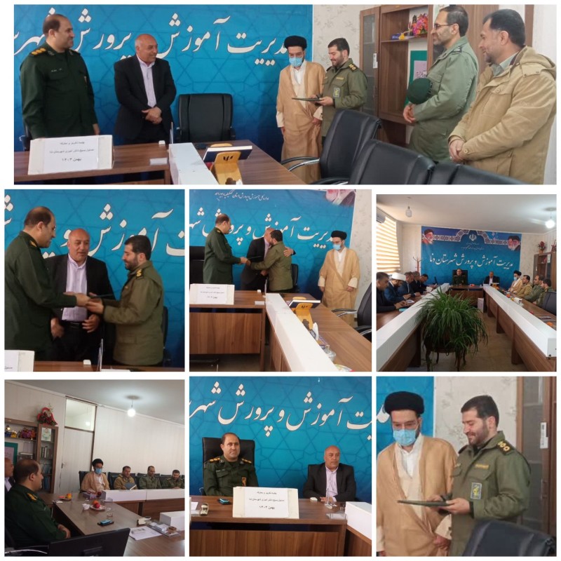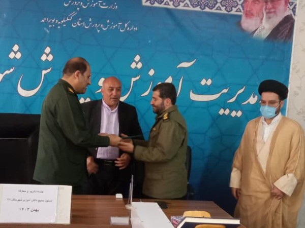 با حضور مدیر آموزش و پرورش شهرستان دنا و جمعی از پرسنل و فرمانده ناحیه مقاومت بسیج جوادالائمه(ع) شهرستان دنا و جمعی از معاونین، آیین تمریم و معارفه مسئول سازمان بسیج دانشآموزی شهر سیسخت برگزار شد.