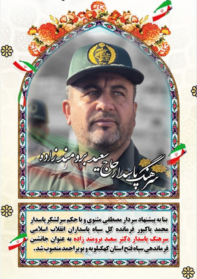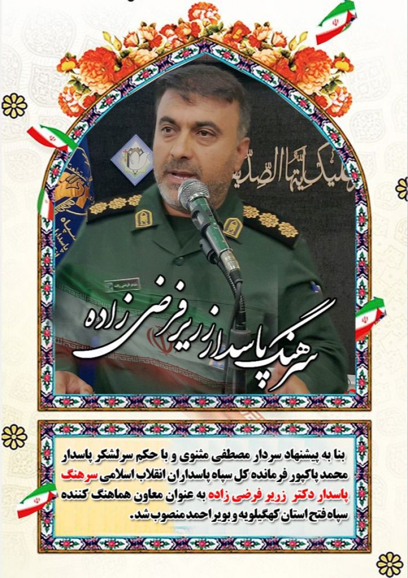سرهنگ پاسدار زریر فرضی زاده جایگزین سعید برومند زاده در معاونت هماهنگ کننده سپاه فتح استان کهگیلویه و بویراحمد میشود.