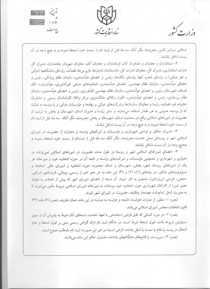 ۲- استانداران و معاونان و مشاوران آنان فرمانداران و معاونان ،آنان معاونان ،شهردار، بخشداران، مدیران کل ادارات استانداری مدیران کل معاونان ادارات کل دادستانها دادیارها بازپرس،ها ،قضات رؤسای دانشگاهها (دولتی و غیر دولتی) و رؤسای شعب آنها رؤسای بانکها رئیس و اعضای هیأت مدیره سازمان نظام پزشکی، رئیس و اعضای هیأت مدیره سازمان نظام مهندسی اعضای هیأت مدیره اتحادیه های صنفی غیر کشوری، هیأت رئیسه اتاق اصناف شهرستان، رئیس و اعضای هیأت مدیره سازمان نظام مهندسی کشاورزی، رئیس و اعضای هیأت مدیره سازمان نظام پرستاری رئیس و اعضای هیأت مدیره کانون وکلای دادگستری مرکز ،وکلا کارشناسان رسمی و مشاوران خانواده قوه قضائیه رؤسا و معاونان سازمانها و شرکتهای دولتی و نهادها و مؤسسات دولتی و یا وابسته به دولت که از بودجه عمومی به هر مقدار استفاده مینمایند و سایر رؤسا و مدیران ،استان شهرستان و بخش به ترتیب از عضویت در شوراهای اسلامی واقع در محدوده استان شهرستان و بخش محرومند مگر آنکه سه ماه قبل از ثبت نام از سمت خود استعفا نموده و به هیچ وجه در آن پست شاغل نباشند.