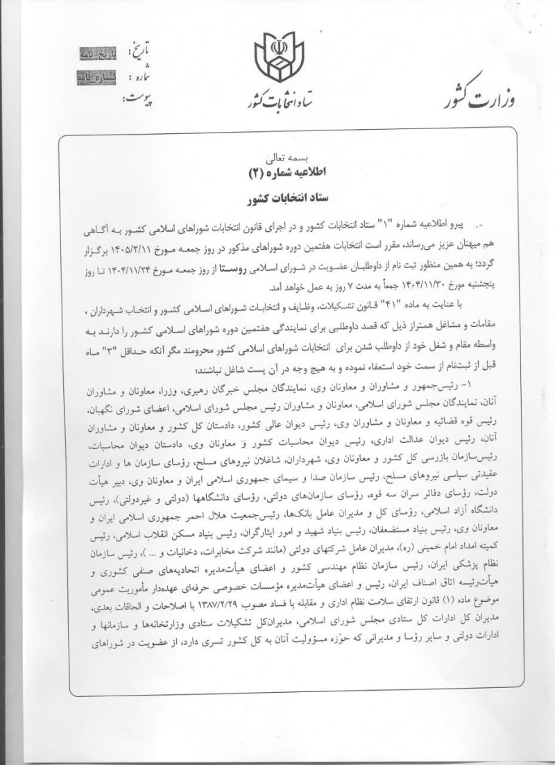 - ● اطلاعیه شماره ۲ ستاد انتخابات کشور منتشر شد
