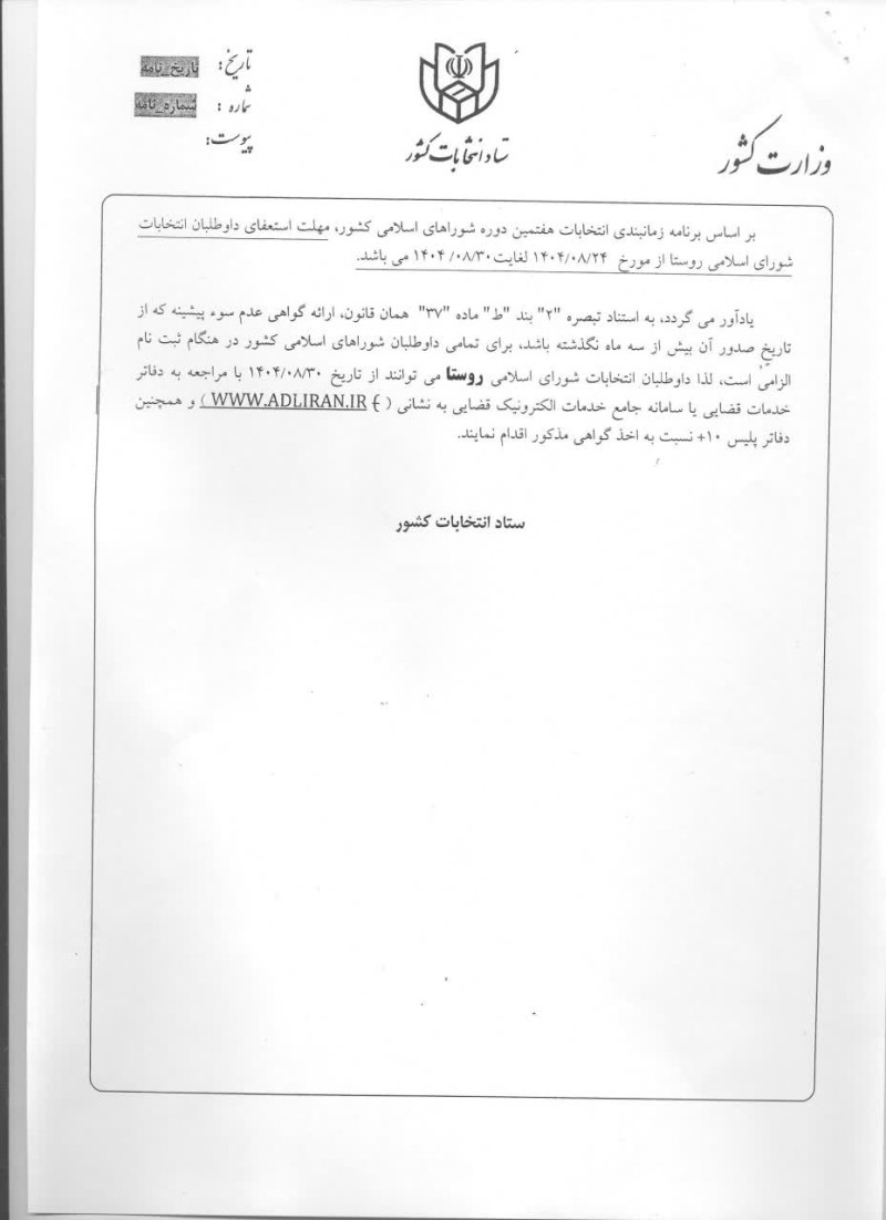 یادآور میگردد به استناد تبصره “۲” بند “ط” ماده ۳۷” همان ،قانون ارائه گواهی عدم سوء پیشینه که از تاریخ صدور آن بیش از سه ماه نگذشته باشد برای تمامی داوطلبان شوراهای اسلامی کشور در هنگام ثبت نام الزامی است لذا داوطلبان انتخابات شورای اسلامی روستا میتوانند از تاریخ ۱۴۰۴/۰۸/۳۰ با مراجعه به دفاتر خدمات قضایی یا سامانه جامع خدمات الکترونیک قضایی به نشانی ) ) .WWW.ADLIRAN.IR ) و همچنین دفاتر پلیس +۱۰ نسبت به اخذ گواهی مذکور اقدام نمایند.